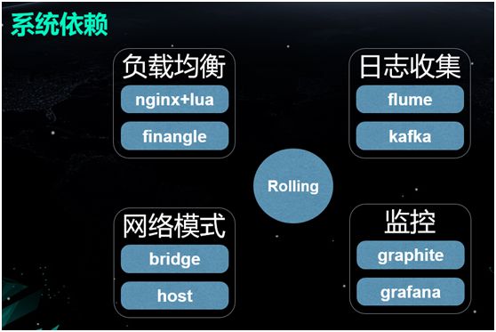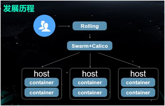 因此,我们在上层使用 Rolling 来进行各种流程的操作,中下层则用 Swarm+Calico 来予以容器和网络的管理。