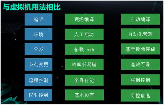 此时我们的平台已经与虚拟机的用法有了较大的区别。如上图所示,主要的不同之处体现在编译、环境、分发、节点变更,流程控制、以及权限控制之上。我们的用法更具自动化。