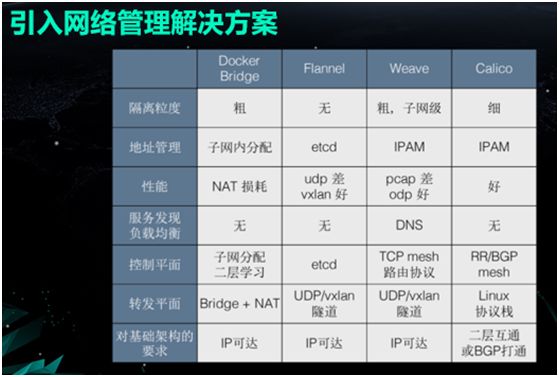 网络连通性,由于是单机软件,Docker 最初默认使用的是 Bridge 模式,不同宿主机之间的网络并不相通。因此,早期大家交流最多的就是如何解决网络连通性的问题。