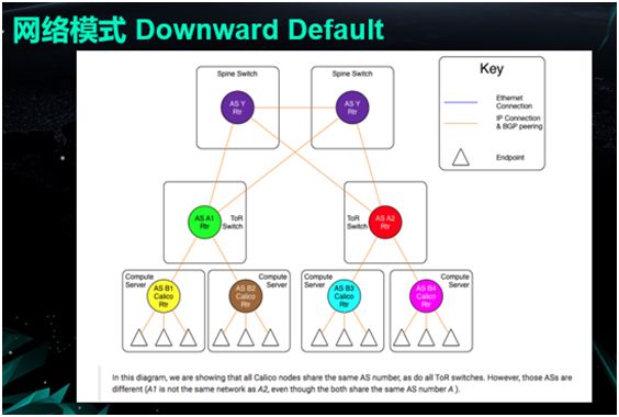 因此我们需要采用这种 Downward Default 部署模式,使得不必让每台物理机都拥有全量的路由表,而仅让交换机持有便可。