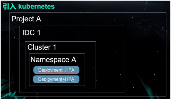 而每个 IDC 里又有着不同的 Kubernetes 集群。同时在每一个集群里,我们为每一个项目都分配了一个 Namespace。