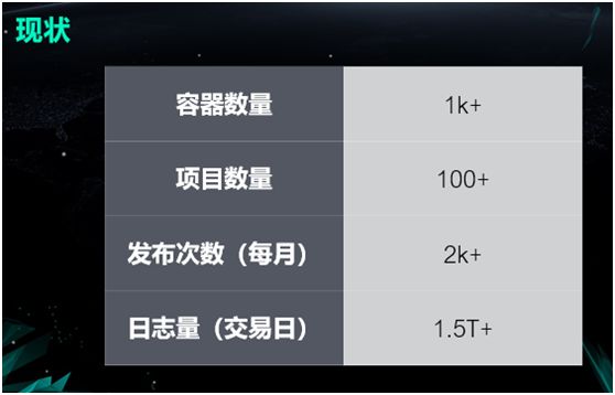 如今,我们的容器只有一千多个,项目数量大概有一百多个。但是我们在部署效率方面的提升还是非常显著的,我们的几十个开发人员每个月所发布的次数就能达到两千多次,每个交易日的日志量大概有 1.5T。