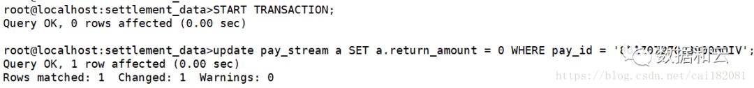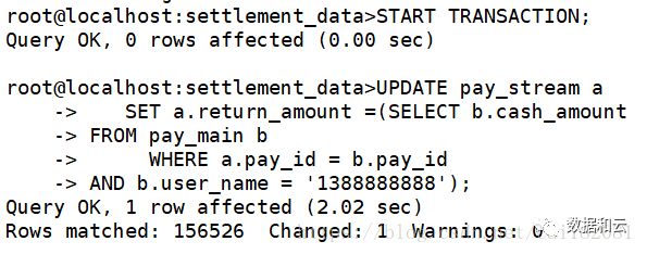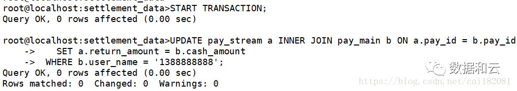 UPDATE pay_stream a INNER JOIN pay_main b ON a.pay_id = b.pay_id SET a.return_amount = 0 WHERE b.user_name = '1388888888'; id select_type table partitions type possible_keys key key_len ref rows filtered Extra ------ ----------- ------ ---------- ------ --------------------- ------------- ------- ------------------------ ------ -------- ------------- 1 SIMPLE b (NULL) ref PRIMARY,idx_user_name idx_user_name 387 const 1 100.00 Using index 1 UPDATE a (NULL) eq_ref PRIMARY PRIMARY 98 settlement_data.b.pay_id 1 100.00 (NULL) DELETE a FROM pay_stream a INNER JOIN pay_main b ON a.pay_id = b.pay_id WHERE b.user_name = '1388888888'; id select_type table partitions type possible_keys key key_len ref rows filtered Extra ------ ----------- ------ ---------- ------ --------------------- ------------- ------- ------------------------ ------ -------- ------------- 1 SIMPLE b (NULL) ref PRIMARY,idx_user_name idx_user_name 387 const 1 100.00 Using index 1 DELETE a (NULL) eq_ref PRIMARY PRIMARY 98 settlement_data.b.pay_id 1 100.00 (NULL)