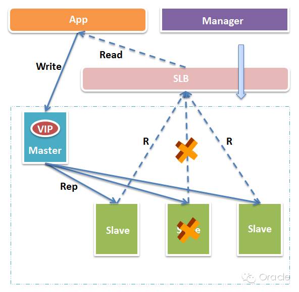 我们可以在 Slave 节点之上加一层 SLB 层,也就是做一下负载均衡,如下:
