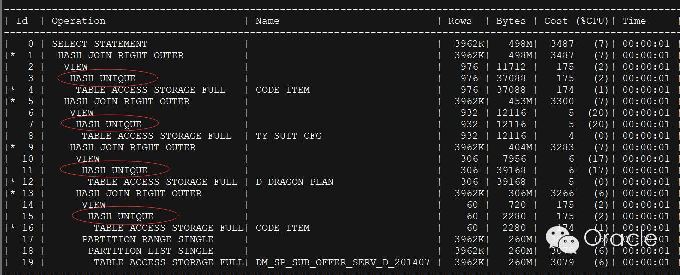 这个SQL一共格式化出来有600多行,由于篇幅的限制,这里把其它一些无用的列的信息去掉。下面来查询一下SQL的执行计划: