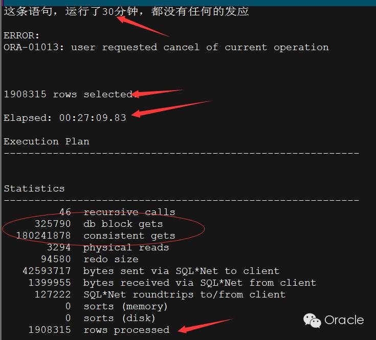 可以看到执行了27分钟,才处理1908315,接近1/2的结果集行数。如果要处理完,估计需要60分钟以上。