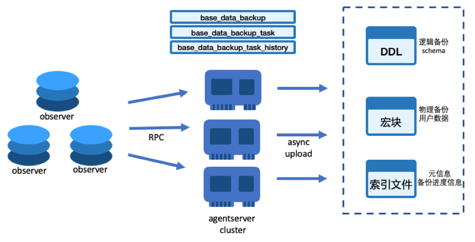 用作记录备份任务的参数配置,通过修改表中的数据,能够动态更改备份的相关参数;同时这些表还会记录备份运行时所需要的中间配置;用作记录基线备份的任务信息,包括备份源集群、备份目的地、备份进度、备份结果以及备份的历史记录,要发起基线备份任务往base_data_backup表中插入相关记录即可,备份的进度可在表base_data_backup_task中看到,备份的结果和历史记录在base_data_backup_task_history表中;用作记录增量备份的任务信息,包括备份源集群、备份目的地和备份的当前位点(checkpoint),这些信息记录在inc_data_backup表中;用作记录恢复的任务信息,恢复过程分为基线恢复和增量恢复,任务的总控信息记录在oceanbase_restore表中,基线恢复记录在base_data_restore表中,增量恢复记录在inc_data_restore表中,恢复结果和历史任务记录在oceanbase_restore_history表中。要发起、暂停备份恢复任务,都通过操作Meta DB中的表来完成,要检查备份恢复任务的状态和进度,需要查询Meta DB中的表。备份恢复模块目前可以通过OCP(OceanBase Cloud Platform,OceanBase的管控平台)来部署和调度。备份恢复的最小粒度为租户,同时支持备份到阿里云对象存储OSS和文件系统中。