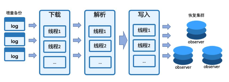 与基线数据备份不同的是,增量备份是一个持续的过程,任务在发起后会一直执行,不断地备份数据变更生成的事务日志,因此增量备份任务没有历史表,任务的状态记录在inc_data_backup表中。除了任务的状态,inc_data_backup表中的另一个重要参数是增量备份位点(checkpoint),代表这个增量备份任务已经备份到的时间点,这是衡量增量备份任务进度以及是否正常运行的重要指标。增量备份虽然与基线备份集成在一起,不需单独启动进程,但是发起备份任务需要单独执行。同时增量备份也是通过RPC接口来读取数据的,因此也需要与OB部署在同一网络中。值得一提的是,OceanBase的增量备份是逻辑备份,不是物理备份,也就是说,增量备份出来的数据所包含的用户数据的变更与MySQL的binlog类似,只包含了变化的内容,没有包含数据在内存或硬盘上的物理变更。OceanBase的恢复过程包含了基线恢复和增量恢复。恢复的最小粒度为租户,用户可以指定恢复结束的具体时间点,恢复程序会找到这个时间点前最近的一个基线备份,基于该版本的基线备份执行基线恢复;等基线恢复完成后,再从基线数据生成的时间点开始执行增量恢复,直至用户指定的恢复结束时间完成增量恢复。等增量恢复完成后,整个恢复任务完成。