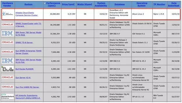 2019 年:OceanBase 获得 TPC-C 基准测试排名榜首。