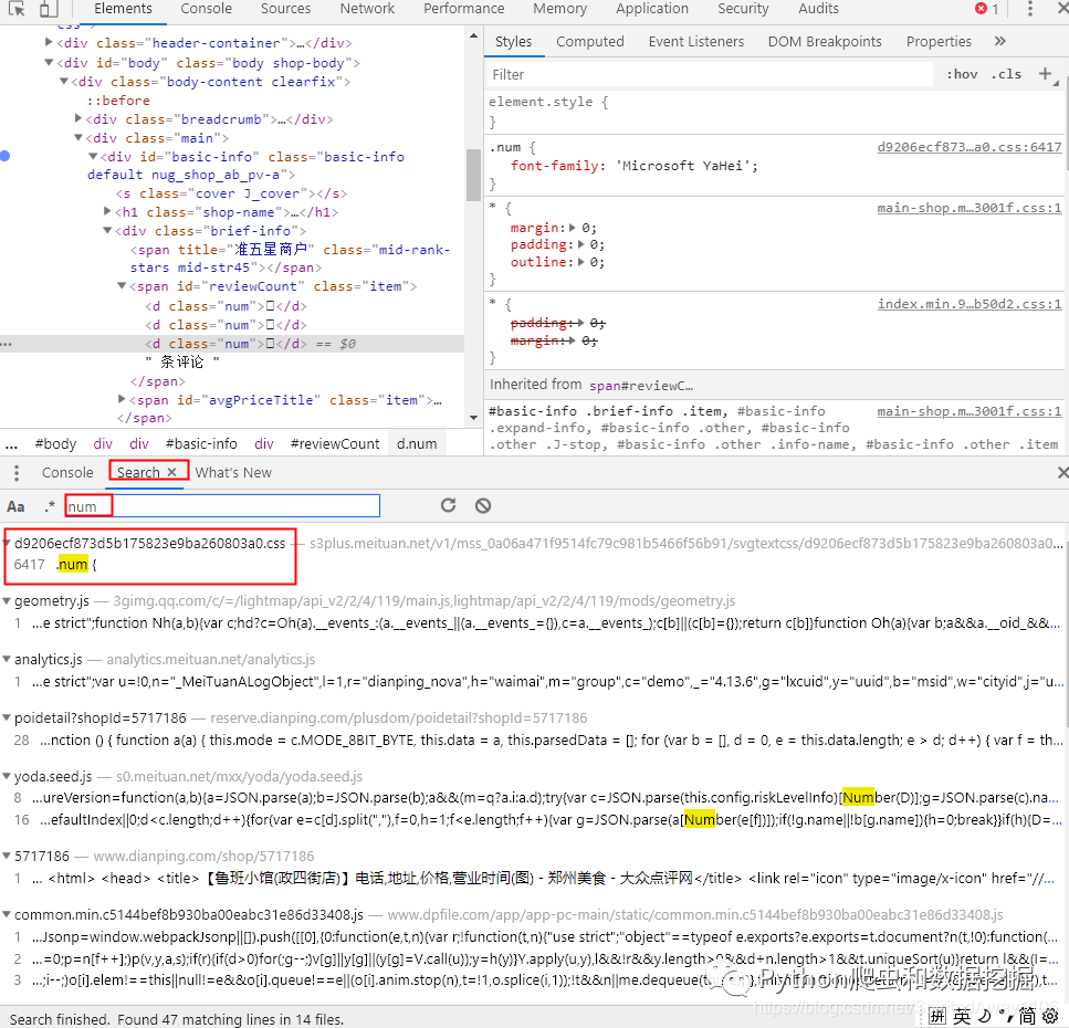 ❝通过上面的简单分析发现,大众点评的部分数字被加密,如何找到代码和数字的对应关系,成了我们的破解加密的关键,我们很容易发现,被加密的数字都是在 d 标签内,且具有共同的 class 属性:num, 那此时猜想,会不会是 num 通过某种规则,被 js 转换成数字?我们先尝试着用 Google 调试页面的全局搜索工具(快捷键ctrl+shift+f),搜索 num 关键字,看会不会有什么惊喜的发现