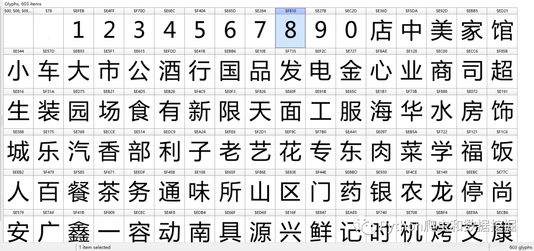 ,我们发现每个新字体上方都有个编码,咦,这个编码怎么有点熟悉,前面提到""代表数字 0 。字体文件里也有个 0,其上方代码是