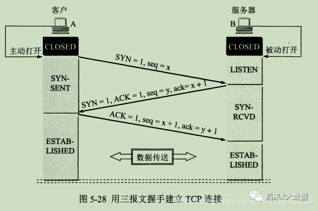 最初的两端TCP都是处于关闭状态,A客户端主动打开,B服务端被动打开后就处于收听状态,准备做出响应 A向B发送连接请求报文段,首部的同步位SYN=1,同时初始序号seq = x(这里的首部的字段我下面会解释),其实这个时候,并不携带数据,也就是只试探性的请求一下。 B收到连接请求报文段后,如果同意建立连接,会向A发送确认。确认的时候SYN=1,ACK=1,确认号ack=x+1,同时也选择一个初始序列号seq=y。这个时候的B就处于SYN-RCVD(同步收到)状态 A收到B的确认信息后,还要向B给出确认,确认报文段的ACK=1,确认号ack=y+1,而序列号seq=x+1。这个时候A处于ESTABLISHED(已建立连接)状态。 B收到A的确认后,也进入ESTABLISHED(已建立连接)状态。
