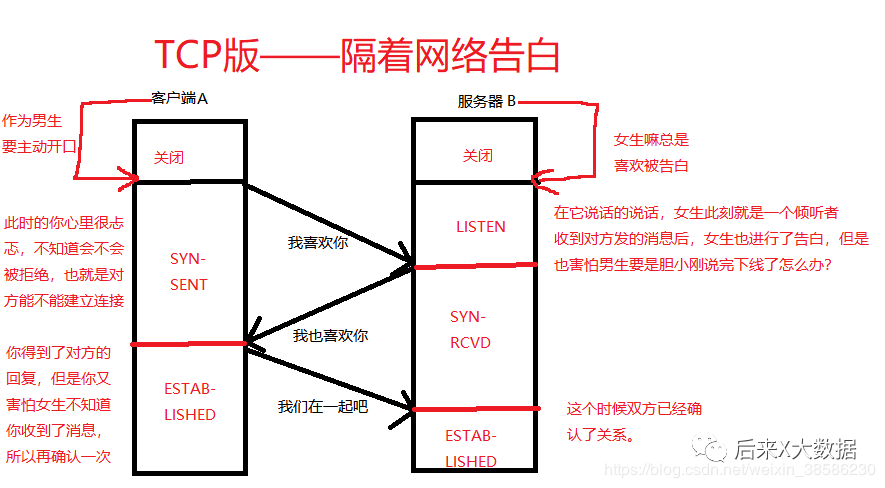 之前有漫画画过这个原理,比较形象,「我们为了说明问题,只考虑单向发送消息,」 假设A是客户端,是要发消息,B是服务器,是收消息的。那么连接图如下: