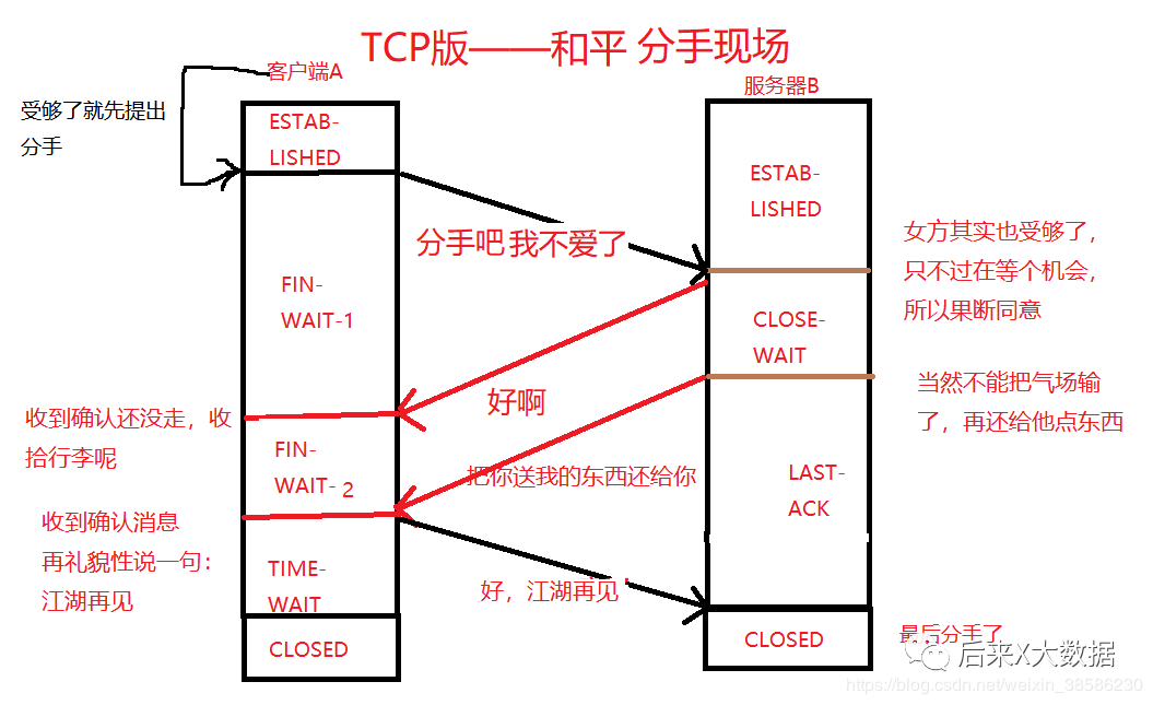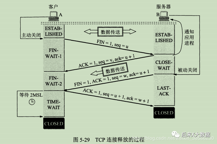 现在A和B都处于 ESTABLISHED状态,A先向自身的TCP发出连接释放报文段,并停止再发送数据,主动关闭TCP连接。A把连接释放报文段首部的终止控制位FN置1,其序号seq=u,这时A进入 FIN-WAIT-1(终止等待1)状态,等待B的确认。 B收到连接释放报文段后即发出确认,确认号是ack=u+1,而这个报文段自己的序号是v,等于B前面已传送过的数据的最后一个字节的序号加1。然后B就进入 CLOSEWAT(关闭等待)状态。【TCP服务器进程这时应通知高层应用进程,所以从A到B这个方向的连接就释放了,这时的TCP连接处于半关闭( half-close)状态,即A已经没有数据要发送了,但B若发送数据,A仍要接收。也就是说,从B到A这个方向的连接并未关闭,这个状态可能会持续一段时间。】 A收到来自B的确认后,就进入 FIN-WA2(终止等待2)状态,等待B发出的连接释放报文段。若B已经没有要向A发送的数据,其应用进程就通知TCP释放连接。这时B发出的连接释放报文段必须使FN=1。 现假定B的序号为w(在半关闭状态B可能又发送了一些数据)。B还必须重复上次已发送过的确认号ack=u+1。这时B就进入LAST-ACK(最后确认)状态,等待A的确认。 A在收到B的连接释放报文段后,必须对此发出确认。在确认报文段中把ACK置1,确认号ack=w+1,而自己的序号是seq=u+1。然后进入到 TIME-WAIT(时间等待)状态。【请注意,现在TCP连接还没有释放掉。必须经过时间等待计时器( TIME- WAIT timer)设置的时间2MSL后,A才进入到 CLOSED状态。时间MSL叫做最长报文段寿命 Maximum Segment Lifetime),RFC793建议设为2分钟,但实际中允许不同的实现允许比较小的MSL值。】