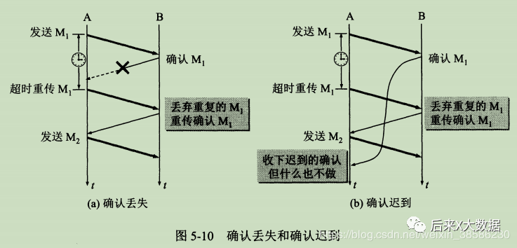 但是如果B确认的消息丢失了,导致A又重新发了一遍,B应该丢弃重复数据再向A发确认收到。如果B确认的消息迟到了,B就会收到2次数据,那么B应该丢弃重复数据再向A发确认收到,同时A会收到2次确认,但收到第二次确认就什么也不做。