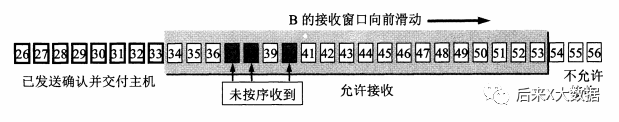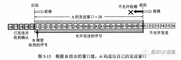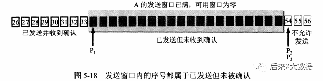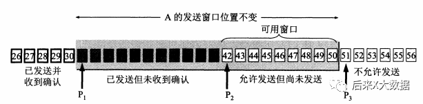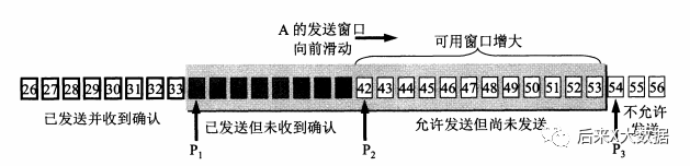 但发送窗口内靠前面有11个字节(黑色小方框表示)表示已发送但未收到确认。而发送窗口内靠后面的9个字节(42~50)是允许发送但尚未发送的。