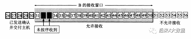 但现在A是发出去了,那么B收到的情况怎么样呢?B的接受也是20,目前30号之前的是确认过的,这部分数据已经交付了,B的缓存就可以不保存。目前B收到了序号32和33,但是乱序的,而31也不知道去哪鬼混了,可能是丢失了。那么B该怎么发送确认消息呢?「B只能对按序收到的数据中的最高序号给出确认,」 也就是确认号依然为31,也就是期望收到的下一个序号仍然是31。