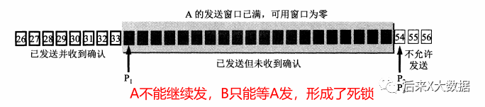 那么思考一个问题:目前A已经把窗口内的字节都发送完了,不能再发送了,除非等到B的确认号,这样A的窗口才能继续向后移动,但可恶的是B的确认信号却在半路上丢失了,那现在A在等B发确认,B以为A收到了,在等A发数据。「形成了死锁」。