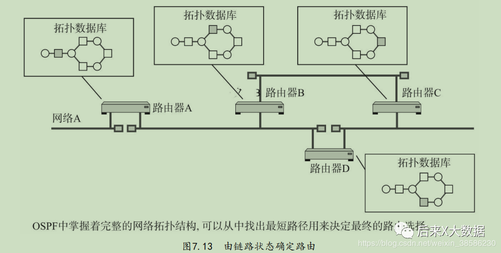 最后所有的路由器会建立一个完整的链路状态数据库,相当于全网的拓扑结构图,而且这个图在全网范围内是唯一的。