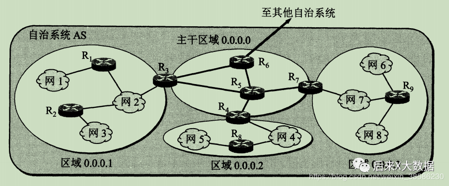 但是互联网实在是太大了,如果把所有的路由器都汇成一张拓扑图,那路由表早就不知道爆了多少次了。于是就对一个自治系统划分为若干个更小的范围,叫做区域,每个区域的路由器不超过200个。