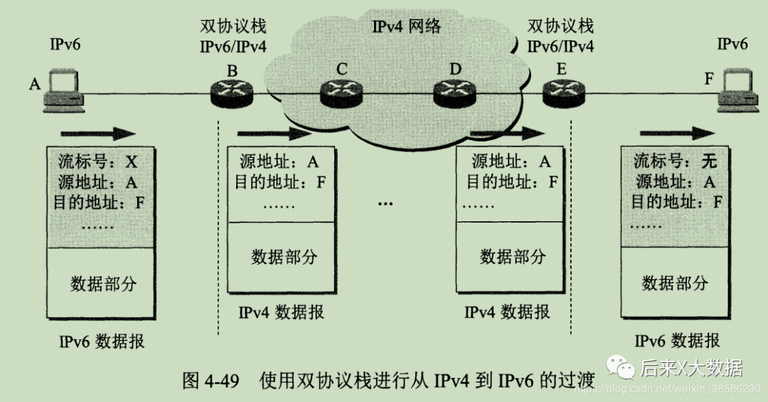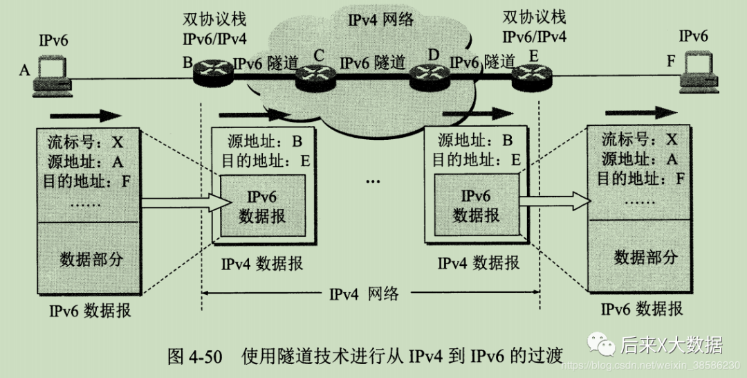 下面这种情况是特别常见的情况,就是中间有一段网络是IPv4怎么办?B 「把IPv6数据报首部转换位IPv4数据报首部再发给C」,传递到E后,E再恢复位IPv6。但是IPv6中的有些字段是无法恢复的,这种损失是首部转换方法不可避免的。