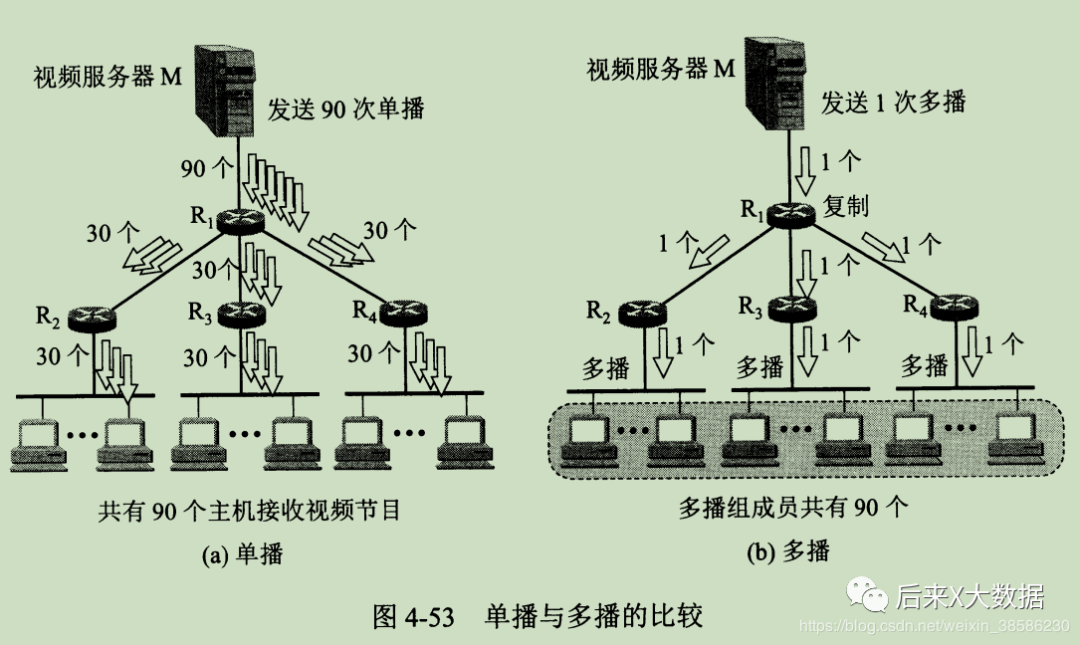假如说,某视频服务器要给90台主机传送同样的视频节目,这样的话,如果使用单播方式,需要同一个分组发送90个次,等于90个副本,但如果使用多播方式,只需要发送一次,爽不爽!