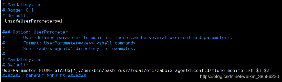 6UserParameter=FLUME_STATUS[*],/etc/zabbix/zabbix_agentd.d/flume_monitor.sh $1 $2