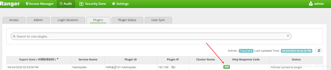 在这里插入图片描述 然后在ranger-admin的audit-->plugin status 查看状态,200即为安装成功