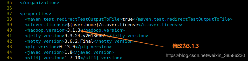 2.需要在pom.xml中更改hadoop.version属性的值,以匹配所使用的hadoop分支的版本。我这里是Apache Hadoop 3.1.3,开心的是Tez0.10.1默认的hadoop版本是3.1.3,不需要改。