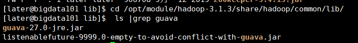 [later@bigdata101 lib]# cd opt/module/hadoop-3.1.3/share/hadoop/common/lib/[later@bigdata101 lib]# ls |grep guavaguava-27.0-jre.jarlistenablefuture-9999.0-empty-to-avoid-conflict-with-guava.jar