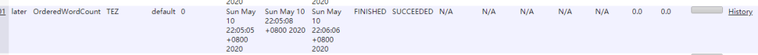 ## 开始测试wordcount,注意你的jar包路径/opt/module/hadoop-3.1.3/bin/yarn jar /opt/module/tez/tez-examples-0.10.1-SNAPSHOT.jar orderedwordcount /tez/word.txt /tez/output/