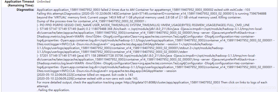 Application application_1589119407952_0003 failed 2 times due to AM Container for appattempt_1589119407952_0003_000002 exited with exitCode: -103Failing this attempt.Diagnostics: [2020-05-10 22:06:09.140]Container [pid=57149,containerID=container_e14_1589119407952_0003_02_000001] is running 759679488B beyond the 'VIRTUAL' memory limit. Current usage: 140.9 MB of 1 GB physical memory used; 2.8 GB of 2.1 GB virtual memory used. Killing container.Dump of the process-tree for container_e14_1589119407952_0003_02_000001 :|- PID PPID PGRPID SESSID CMD_NAME USER_MODE_TIME(MILLIS) SYSTEM_TIME(MILLIS) VMEM_USAGE(BYTES) RSSMEM_USAGE(PAGES) FULL_CMD_LINE|- 57149 57147 57149 57149 (bash) 0 2 118079488 368 /bin/bash -c /opt/module/jdk1.8.0_211/bin/java -Djava.io.tmpdir=/opt/module/hadoop-3.1.3/tmp/nm-local-dir/usercache/later/appcache/application_1589119407952_0003/container_e14_1589119407952_0003_02_000001/tmp -server -Djava.net.preferIPv4Stack=true -Dhadoop.metrics.log.level=WARN -Xmx1024m -Dlog4j.configuratorClass=org.apache.tez.common.TezLog4jConfigurator -Dlog4j.configuration=tez-container-log4j.properties -Dyarn.app.container.log.dir=/opt/module/hadoop-3.1.3/logs/userlogs/application_1589119407952_0003/container_e14_1589119407952_0003_02_000001 -Dtez.root.logger=INFO,CLA -Dsun.nio.ch.bugLevel='' org.apache.tez.dag.app.DAGAppMaster --session 1>/opt/module/hadoop-3.1.3/logs/userlogs/application_1589119407952_0003/container_e14_1589119407952_0003_02_000001/stdout 2>/opt/module/hadoop-3.1.3/logs/userlogs/application_1589119407952_0003/container_e14_1589119407952_0003_02_000001/stderr|- 57201 57149 57149 57149 (java) 871 158 2896457728 35706 /opt/module/jdk1.8.0_211/bin/java -Djava.io.tmpdir=/opt/module/hadoop-3.1.3/tmp/nm-local-dir/usercache/later/appcache/application_1589119407952_0003/container_e14_1589119407952_0003_02_000001/tmp -server -Djava.net.preferIPv4Stack=true -Dhadoop.metrics.log.level=WARN -Xmx1024m -Dlog4j.configuratorClass=org.apache.tez.common.TezLog4jConfigurator -Dlog4j.configuration=tez-container-log4j.properties -Dyarn.app.container.log.dir=/opt/module/hadoop-3.1.3/logs/userlogs/application_1589119407952_0003/container_e14_1589119407952_0003_02_000001 -Dtez.root.logger=INFO,CLA -Dsun.nio.ch.bugLevel= org.apache.tez.dag.app.DAGAppMaster --session[2020-05-10 22:06:09.222]Container killed on request. Exit code is 143[2020-05-10 22:06:09.229]Container exited with a non-zero exit code 143.For more detailed output, check the application tracking page: http://bigdata101:8088/cluster/app/application_1589119407952_0003 Then click on links to logs of each attempt.. Failing the application.