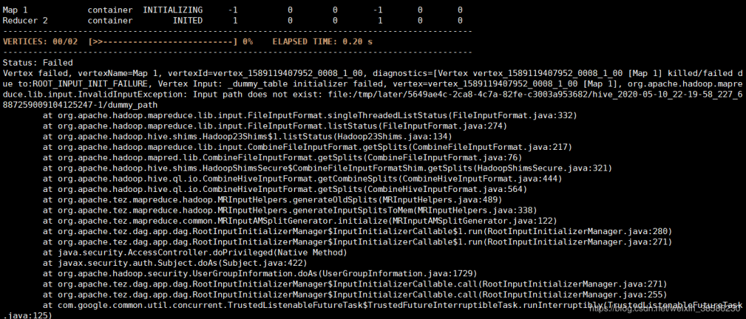 Status: FailedVertex failed, vertexName=Map 1, vertexId=vertex_1589119407952_0008_1_00, diagnostics=[Vertex vertex_1589119407952_0008_1_00 [Map 1] killed/failed due to:ROOT_INPUT_INIT_FAILURE, Vertex Input: _dummy_table initializer failed, vertex=vertex_1589119407952_0008_1_00 [Map 1], org.apache.hadoop.mapreduce.lib.input.InvalidInputException: Input path does not exist: file:/tmp/later/5649ae4c-2ca8-4c7a-82fe-c3003a953682/hive_2020-05-10_22-19-58_227_6887259009104125247-1/dummy_pathat org.apache.hadoop.mapreduce.lib.input.FileInputFormat.singleThreadedListStatus(FileInputFormat.java:332)at org.apache.hadoop.mapreduce.lib.input.FileInputFormat.listStatus(FileInputFormat.java:274)at org.apache.hadoop.hive.shims.Hadoop23Shims$1.listStatus(Hadoop23Shims.java:134)at org.apache.hadoop.mapreduce.lib.input.CombineFileInputFormat.getSplits(CombineFileInputFormat.java:217)at org.apache.hadoop.mapred.lib.CombineFileInputFormat.getSplits(CombineFileInputFormat.java:76)at org.apache.hadoop.hive.shims.HadoopShimsSecure$CombineFileInputFormatShim.getSplits(HadoopShimsSecure.java:321)at org.apache.hadoop.hive.ql.io.CombineHiveInputFormat.getCombineSplits(CombineHiveInputFormat.java:444)at org.apache.hadoop.hive.ql.io.CombineHiveInputFormat.getSplits(CombineHiveInputFormat.java:564)at org.apache.tez.mapreduce.hadoop.MRInputHelpers.generateOldSplits(MRInputHelpers.java:489)at org.apache.tez.mapreduce.hadoop.MRInputHelpers.generateInputSplitsToMem(MRInputHelpers.java:338)at org.apache.tez.mapreduce.common.MRInputAMSplitGenerator.initialize(MRInputAMSplitGenerator.java:122)at org.apache.tez.dag.app.dag.RootInputInitializerManager$InputInitializerCallable$1.run(RootInputInitializerManager.java:280)at org.apache.tez.dag.app.dag.RootInputInitializerManager$InputInitializerCallable$1.run(RootInputInitializerManager.java:271)at java.security.AccessController.doPrivileged(Native Method)at javax.security.auth.Subject.doAs(Subject.java:422)at org.apache.hadoop.security.UserGroupInformation.doAs(UserGroupInformation.java:1729)at org.apache.tez.dag.app.dag.RootInputInitializerManager$InputInitializerCallable.call(RootInputInitializerManager.java:271)at org.apache.tez.dag.app.dag.RootInputInitializerManager$InputInitializerCallable.call(RootInputInitializerManager.java:255)at com.google.common.util.concurrent.TrustedListenableFutureTask$TrustedFutureInterruptibleTask.runInterruptibly(TrustedListenableFutureTask.java:125)at com.google.common.util.concurrent.InterruptibleTask.run(InterruptibleTask.java:57)at com.google.common.util.concurrent.TrustedListenableFutureTask.run(TrustedListenableFutureTask.java:78)at java.util.concurrent.ThreadPoolExecutor.runWorker(ThreadPoolExecutor.java:1149)at java.util.concurrent.ThreadPoolExecutor$Worker.run(ThreadPoolExecutor.java:624)at java.lang.Thread.run(Thread.java:748)]