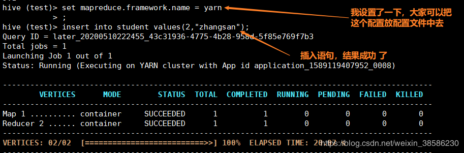 这里记得设置一下 set mapreduce.framework.name = yarn