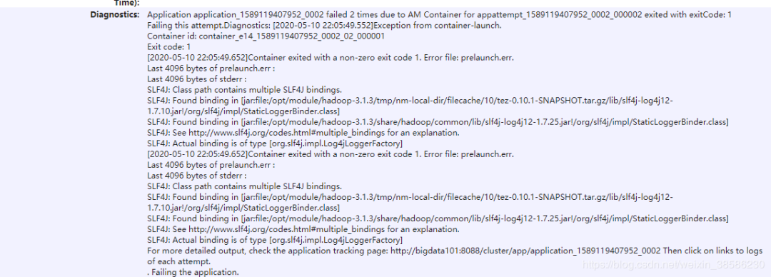 Application application_1589119407952_0002 failed 2 times due to AM Container for appattempt_1589119407952_0002_000002 exited with exitCode: 1Failing this attempt.Diagnostics: [2020-05-10 22:05:49.552]Exception from container-launch.Container id: container_e14_1589119407952_0002_02_000001Exit code: 1[2020-05-10 22:05:49.652]Container exited with a non-zero exit code 1. Error file: prelaunch.err.Last 4096 bytes of prelaunch.err :Last 4096 bytes of stderr :SLF4J: Class path contains multiple SLF4J bindings.SLF4J: Found binding in [jar:file:/opt/module/hadoop-3.1.3/tmp/nm-local-dir/filecache/10/tez-0.10.1-SNAPSHOT.tar.gz/lib/slf4j-log4j12-1.7.10.jar!/org/slf4j/impl/StaticLoggerBinder.class]SLF4J: Found binding in [jar:file:/opt/module/hadoop-3.1.3/share/hadoop/common/lib/slf4j-log4j12-1.7.25.jar!/org/slf4j/impl/StaticLoggerBinder.class]SLF4J: See http://www.slf4j.org/codes.html#multiple_bindings for an explanation.SLF4J: Actual binding is of type [org.slf4j.impl.Log4jLoggerFactory][2020-05-10 22:05:49.652]Container exited with a non-zero exit code 1. Error file: prelaunch.err.Last 4096 bytes of prelaunch.err :Last 4096 bytes of stderr :SLF4J: Class path contains multiple SLF4J bindings.SLF4J: Found binding in [jar:file:/opt/module/hadoop-3.1.3/tmp/nm-local-dir/filecache/10/tez-0.10.1-SNAPSHOT.tar.gz/lib/slf4j-log4j12-1.7.10.jar!/org/slf4j/impl/StaticLoggerBinder.class]SLF4J: Found binding in [jar:file:/opt/module/hadoop-3.1.3/share/hadoop/common/lib/slf4j-log4j12-1.7.25.jar!/org/slf4j/impl/StaticLoggerBinder.class]SLF4J: See http://www.slf4j.org/codes.html#multiple_bindings for an explanation.SLF4J: Actual binding is of type [org.slf4j.impl.Log4jLoggerFactory]For more detailed output, check the application tracking page: http://bigdata101:8088/cluster/app/application_1589119407952_0002 Then click on links to logs of each attempt.. Failing the application.