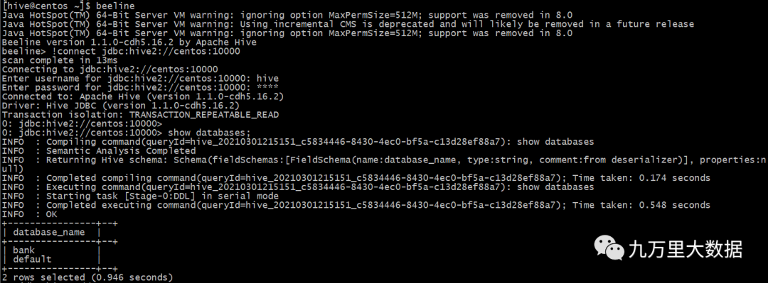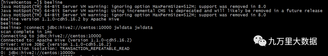 对于没有开启kerberos认证的集群,可以输入任意的username和password。也可以敲Enter键表示空。其中centos是我的hiveserver2的主机名,用户需要修改成自己的hiveserver2名。比如我使用了任意的用户名和密码jwldata,如下图所示,成功连接到了hiveserver2