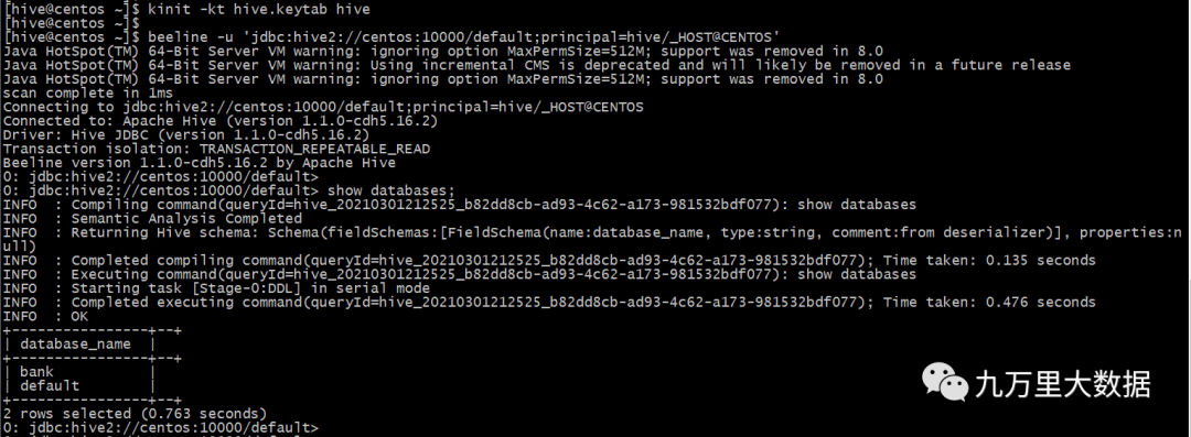 然后使用非交互式连接hive,增加principal=hive/_HOST@CENTOS,其中CENTOS是我的Kerberos KDC名字,用户需要修改成自己的KDC名。