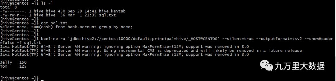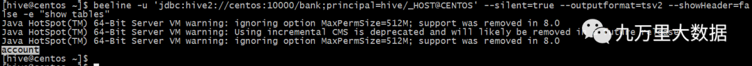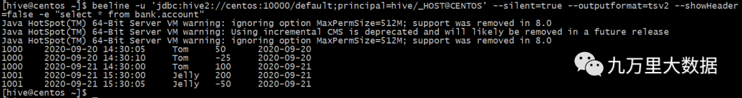 beeline -u 'jdbc:hive2://centos:10000/default;principal=hive/_HOST@CENTOS' --silent=true --outputformat=tsv2 --showHeader=false -e "select * from bank.account"