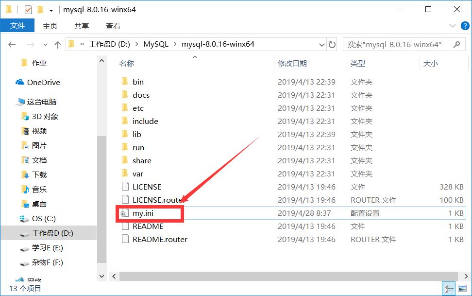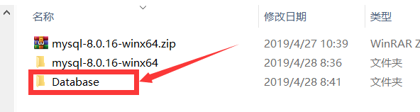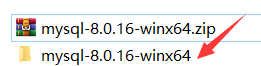 1.打开下载的mysql-8.0.16-winx64文件,在当前目录下,新建一个名为my.ini的文件,然后打开该文件,将下列代码加入到该文件中;