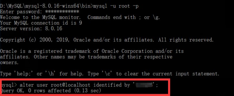 6.如果你觉得之前的密码太复杂,你可以另外设置登录密码,在第7步之后,你会发现mysql>后有一个光标一直在闪烁,这个时候,你输入alter user root@localhost identified by '新密码',若出现OK字样,就说明你密码修改成功了,等到下次登录输入新密码就行了。