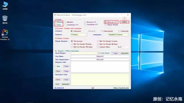 打开注册机后,在1) Patch,勾选Backup、Host和Navicat v12,然后点击Patch按钮: