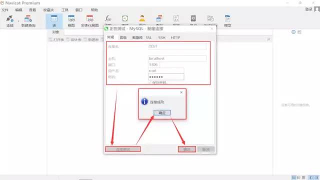 设置相关的连接信息,点击测试连接,测试是否能连接上MySQL数据库。若弹出连接成功窗口,则表示连接MySQL数据库成功,点击确定: