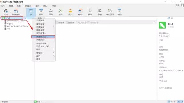 右键刚刚建立的连接TEST,可以打开连接、关闭连接和创建数据库等等操作,实现对MySQL数据库管理: