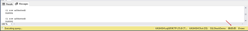 运行SQL,在 tblSQLShackDemo 表中插入批量记录并在大约3分钟后终止会话。