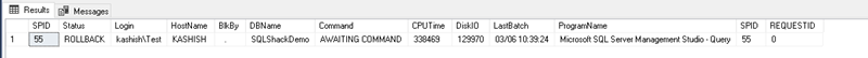 现在我们Kill掉SPID以启动回滚过程。执行命令KILL 55,在这个命令中,55是运行INSERT语句会话的SPID