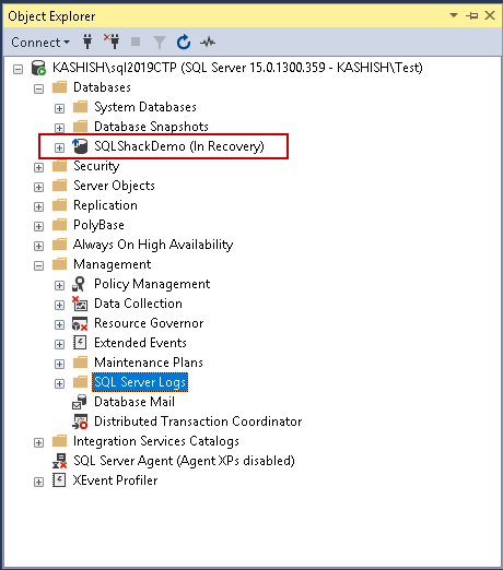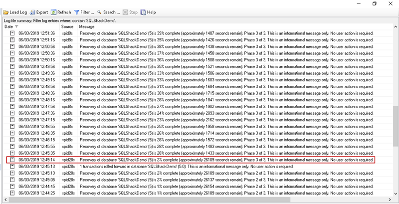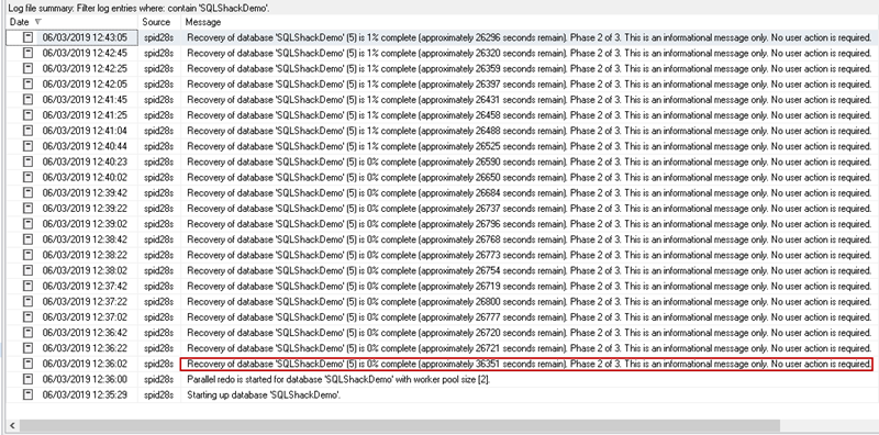Recovery of database ‘SQLShackDemo’ (5) is 0% complete (approximately 36351 seconds remain). Phase 2 of 3. This is an informational message only. No user action is required.