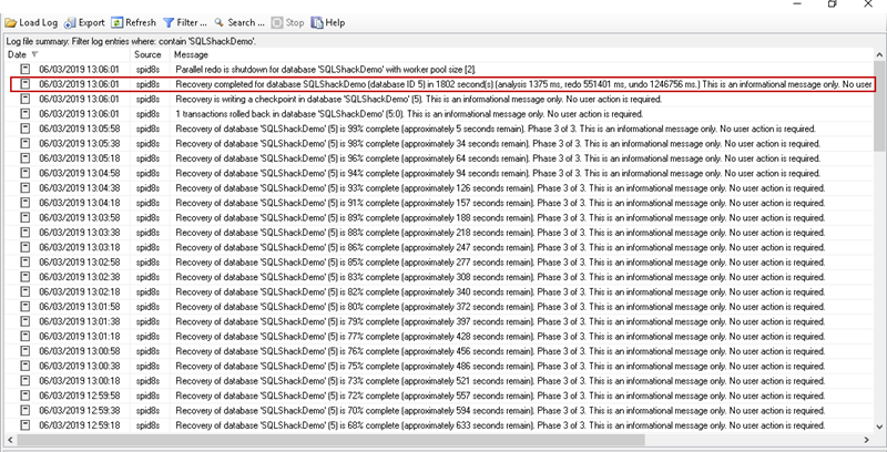 Recovery completed for database SQLShackDemo (database ID 5) in 1802 second(s) (analysis 1375 ms, redo 551401 ms, undo 1246756 ms.) This is an informational message only. No user action is required.