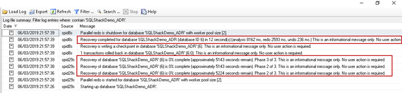 Recovery completed for database SQLShackDemo_ADR (database ID 6) in 12 second(s) (analysis 8162 ms, redo 2593 ms, undo 236 ms.) This is an informational message only. No user action is required.