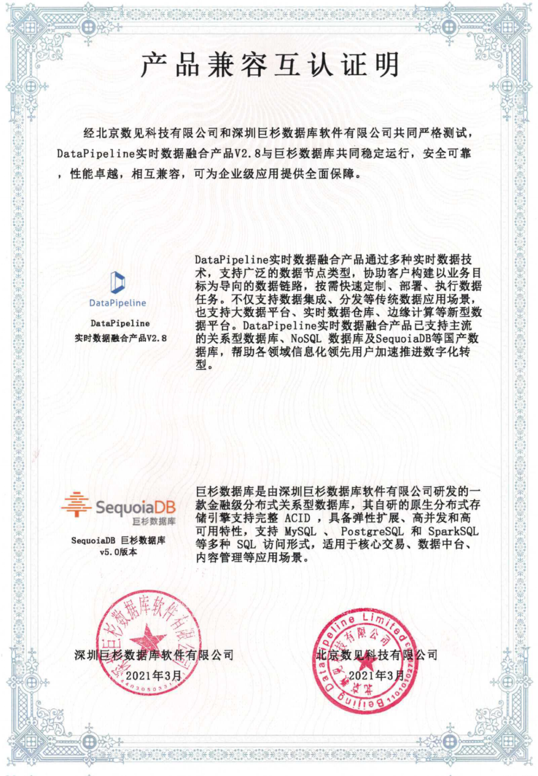 近期,广州巨杉软件开发有限公司与北京数见科技有限公司(以下简称DataPipeline)顺利完成产品互认证工作。本次兼容性互认证经巨杉数据库与DataPipeline联合测试得出:产品性能优异相互兼容、功能性与安全可靠性俱佳,能够为企业级客户提供高效安全的数据管理服务。