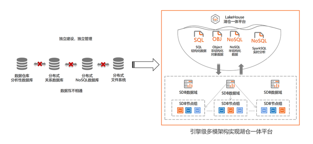 SequoiaDB-DP具备引擎级多模特性,可提供结构化、半结构化和非结构化数据的存储能力,实现了SQL、NoSQL和Object并存,避免传统数据湖、数据仓库独立建设带来的ETL延迟及数据冗余存储,有效降低技术栈的复杂性。